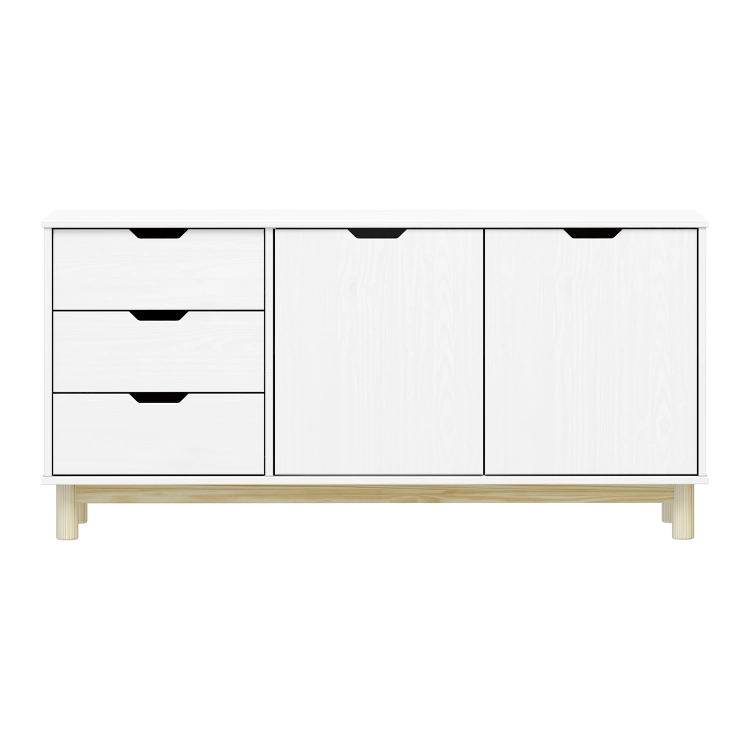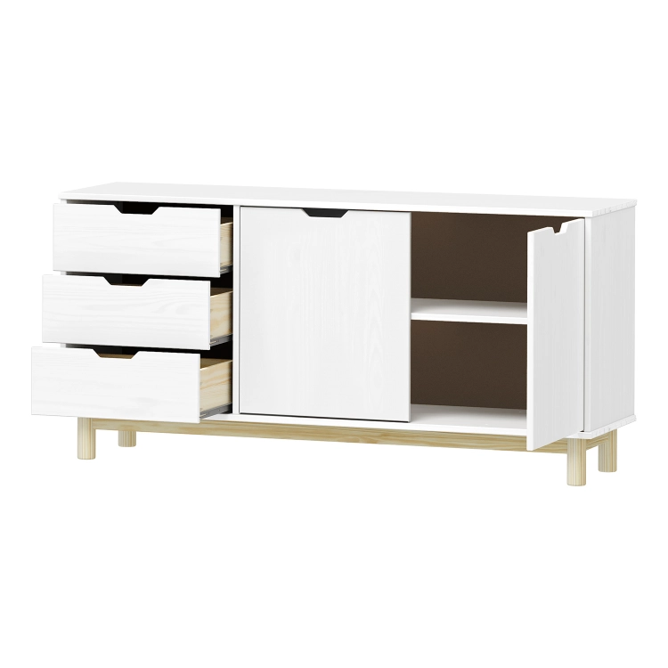 Materiál Masiv Barva Bílá Dekor dřeva borovice Rozměry (cm) 140 x 40 x 67 cm Váha: 30 kg Přepravní rozměry a info: Karton: 2 ks Kód produktu: mp-32431b-komoda-2-dvere-3-zasuvky-bonito-2-bily-lak / 32431B -