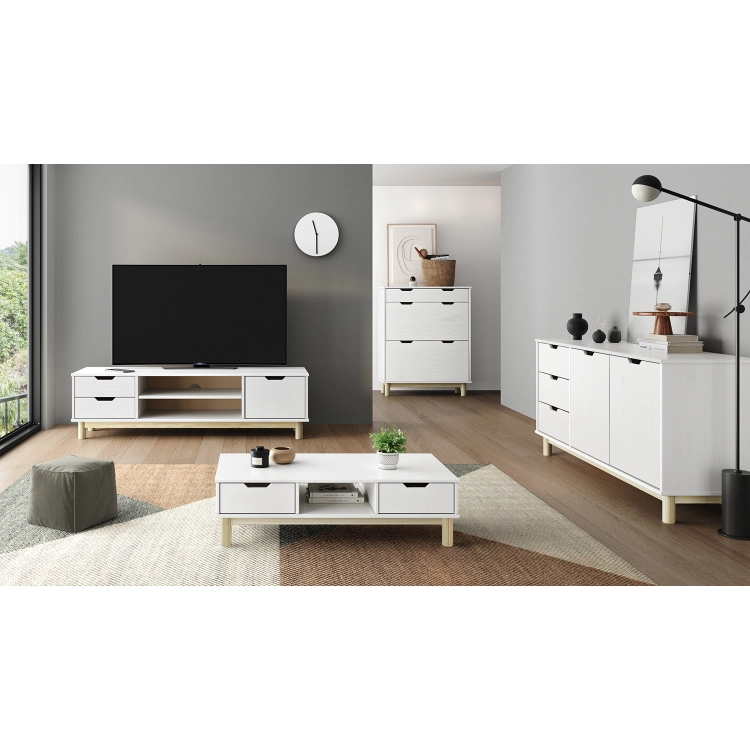 Materiál Masiv Barva Bílá Dekor dřeva borovice Rozměry (cm) 115 x 40 x 67 cm Váha: 22 kg Přepravní rozměry a info: Karton: 2 ks Kód produktu: mp-324267b-komoda-3-3-zasuvky-bonito-2-bily-lak / 324267B -