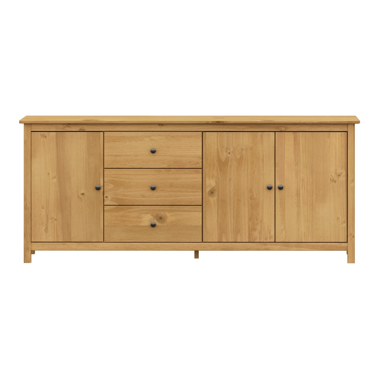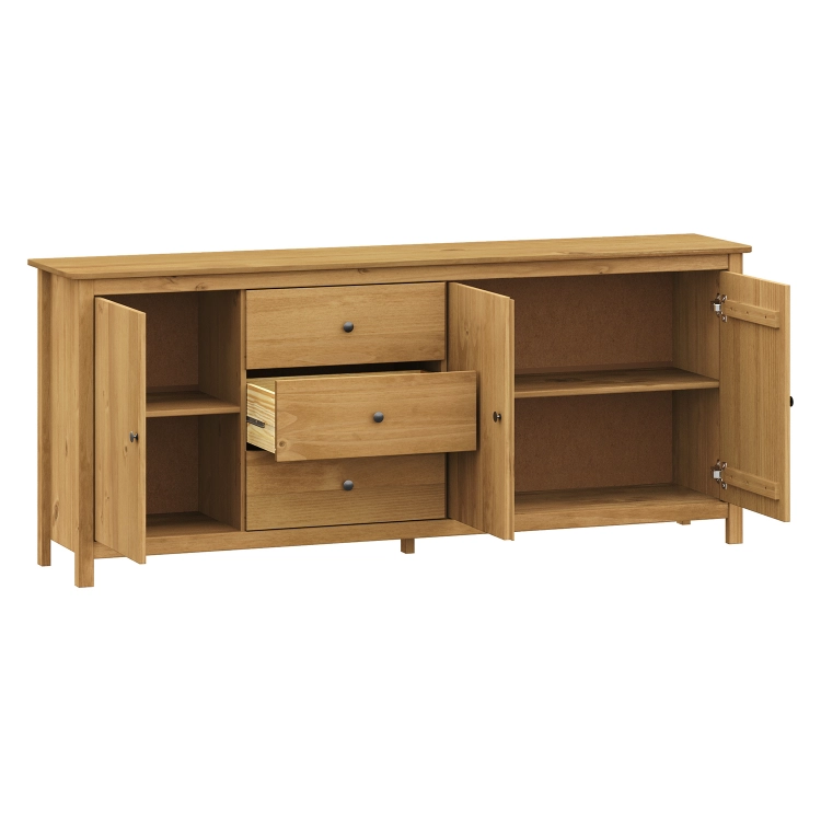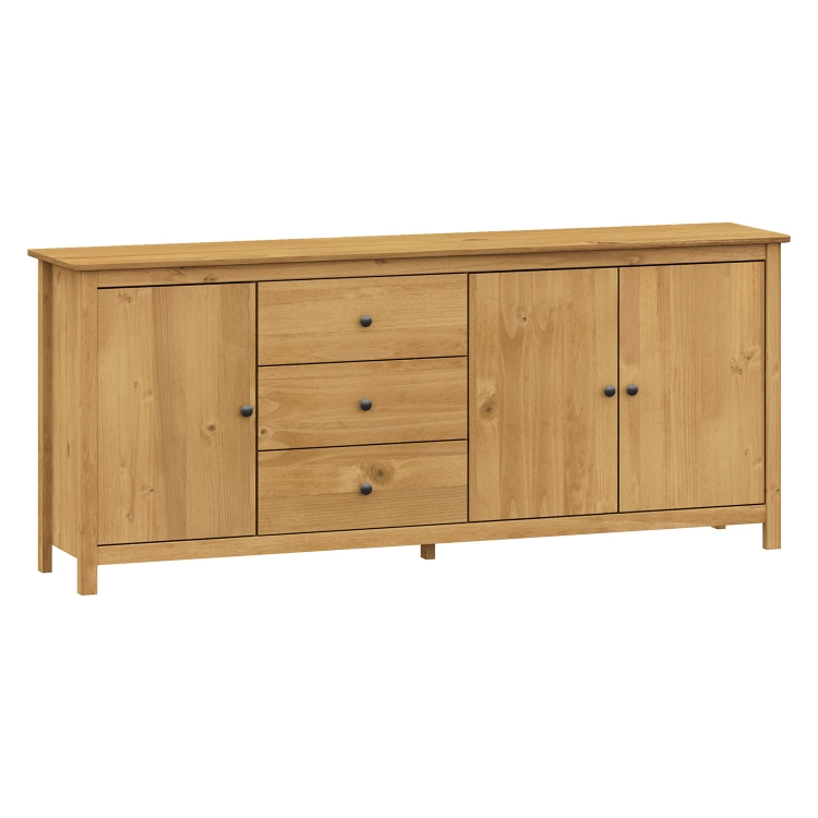 materiál masiv borovice voskovaná v medovém odstínu kovové úchytky v barevném provedení černěná mosaz 3 zásuvky s kovovými pojezdy, 3 plné dveře, 2 police maximální nosnosti uvedeny v návodu k montáži