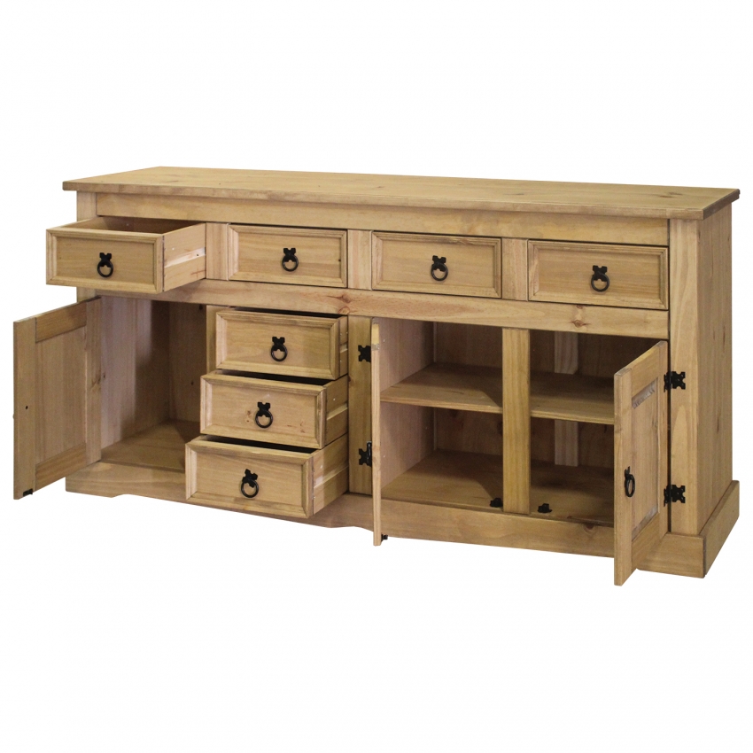 materiál masiv borovice voskovaná v medovém odstínu 3 dvířka, 1 police, 7 zásuvek, kovové ozdobné úchytky součást sestavy Corona