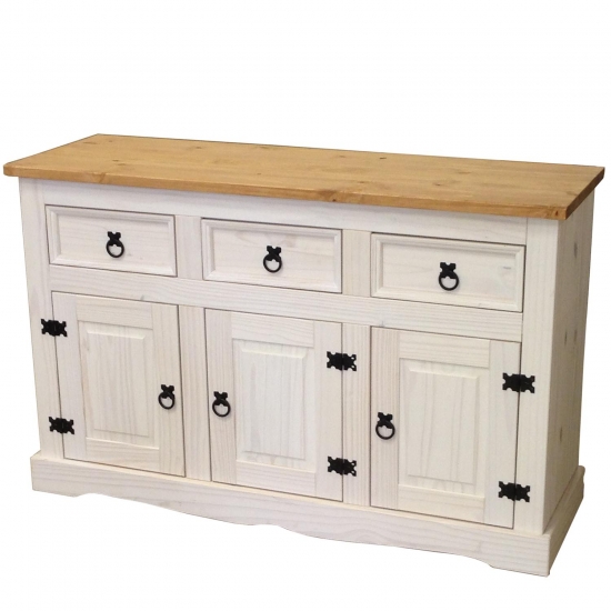 materiál masiv borovice voskovaná v bílém odstínu horní deska masiv borovice voskovaná v medovém odstínu 3 malé zásuvky, 3 dvířka, 1 police, kovové ozdobné úchytky součást sestavy Corona bílá