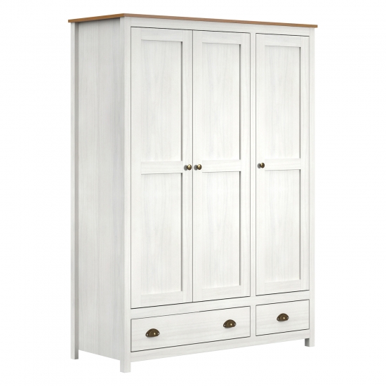 materiál masiv borovice, barevné provedení bílý / hnědý lak dvě zásuvky s kovovými úchytkami a pojezdy v levé části 3 police, v pravé části 1 police a kovová šatní tyč vhodný doplněk 3dveřový nástavec TOPAZIO 206952