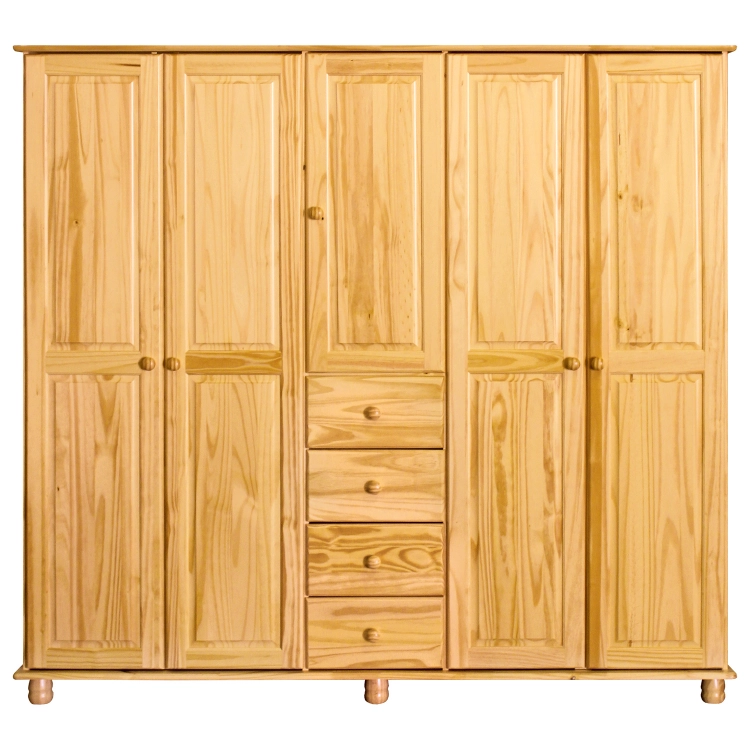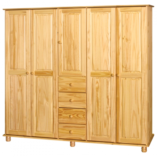 Krásná pětidveřová šatní skříň vyrobená z masivního borovicového dřeva. Nábytek je vyroben v lakovaném provedení.