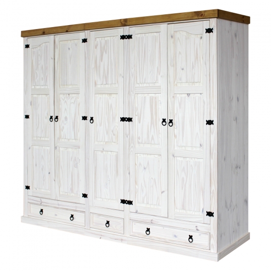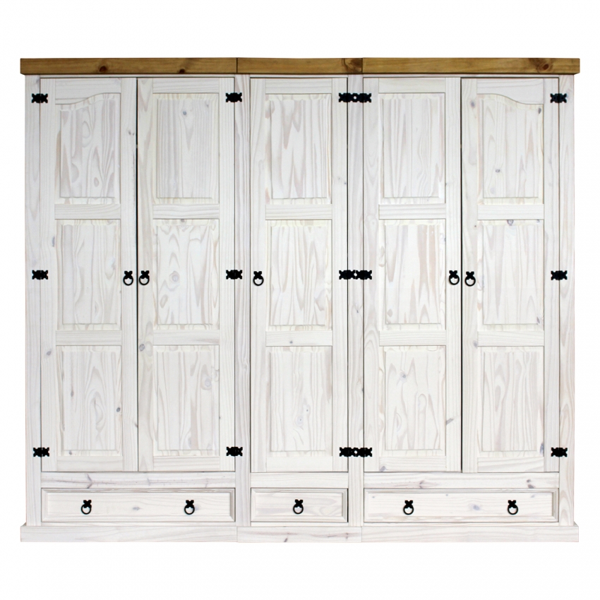 materiál masiv borovice voskovaná v bílém odstínu horní lem masiv borovice voskovaná v medovém odstínu prostor dělený v poměru 2:1:2 v obou širších částech šatní tyč a police na klobouky, střední užší část 3 variabilní police ve spodní části 2 velké a 1 malá zásuvka, kovové ozdobné úchytky součást sestavy Corona bílá