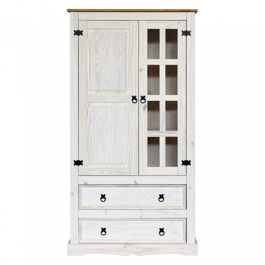 materiál masiv borovice voskovaná v bílém odstínu horní deska masiv borovice voskovaná v medovém odstínu prosklená část, 3 police, 1 plná dvířka, 2 velké zásuvky hloubka zásuvky 32 cm, kovové ozdobné úchytky součást sestavy Corona bílá