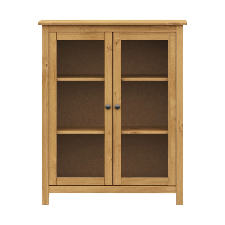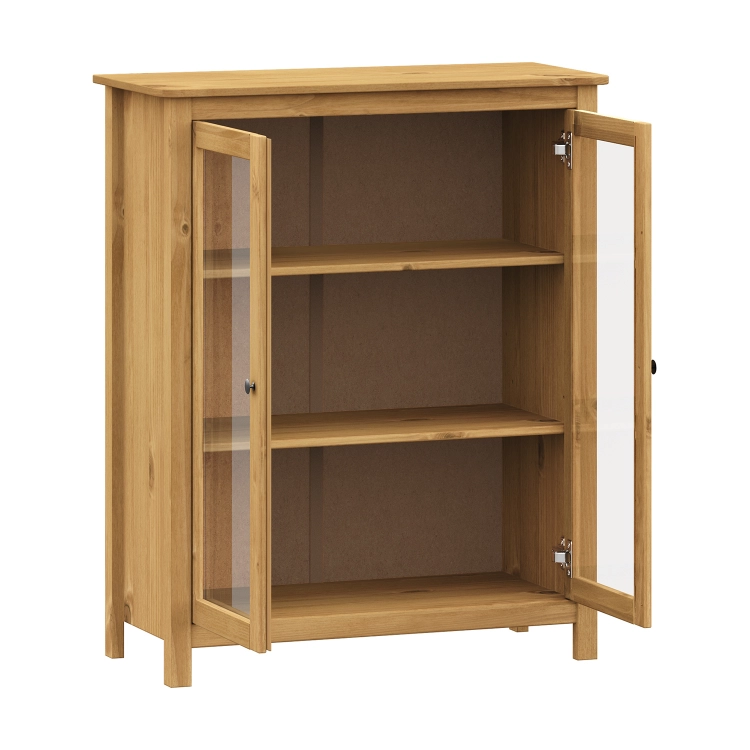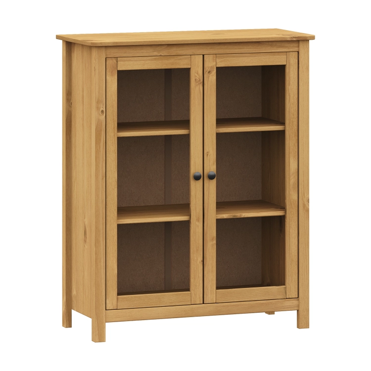 materiál masiv borovice voskovaná v medovém odstínu kovové úchytky v barevném provedení černěná mosaz 2 prosklené dveře, 2 police maximální nosnosti uvedeny v návodu k montáži